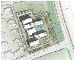 (河西分院)项目地处梅溪湖国际新城,项目总建筑面积达 14.6 万平方米,采用分期建设模式 ( 总图见图 1)。一期工程建筑面积12.6 万平方米,涵盖五层裙房和三座功能塔楼(门诊、急诊、住院、教学及科研),并配建二层地下室,规划设置500 台牙椅和200 张住院病床,旨在满足基础医疗与教学科研需求。二期为预留发展用地,建筑面积约 2 万平方米,为远期扩容提供空间。项目定位为集三级甲等口腔专科医院、口腔医学院和口腔医学研究院于一体的多功能集群,未来将服务湘江新区 300 万人口,通过医疗、教育、科研三位一体的协同发展,提升区域口腔健康服务水平。