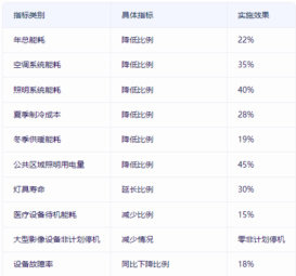 虽然项目尚未投入运营,但基于智慧化节能路径的规划与实施,预计医院在未来运营中可实现年总能耗的显著降低。通过能源系统集成与智慧运维平台的综合应用,医院有望在未来运营中实现空调系统能耗下降、照明系统能耗降低、医疗设备能效提升等多重节能目标,为医院可持续发展奠定坚实基础(见表1)。
