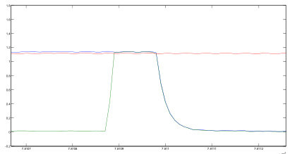 注:绿色曲线为线圈负端对控制负端电压,微机驱动时 0V,断开时 74V;蓝色曲线为线圈正端电压,线圈得电自保时为 74V;红色曲线为线圈自保触点前端电压,正端电路正常时为74V。