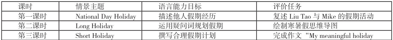 以六年级上册Unit 3 “Holiday Fun”为例,”围绕“假期意义”主题,将三个课时分别定位为“描述经历(National Day Holiday)→认识文化(Long Holiday) $$ 规划生活(Short Holiday)”,形成阶梯式目标链。
