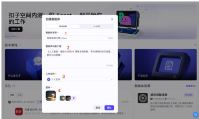 在弹出的创建智能体对话框中,进行智能体的相关设置(见图2):