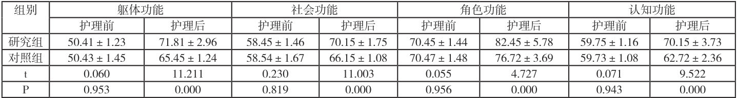 经 6 个月的护理,研究组 QLQ-C30 评分各项指标均明显高于对照组( P<0.05 ),如表2 所示。