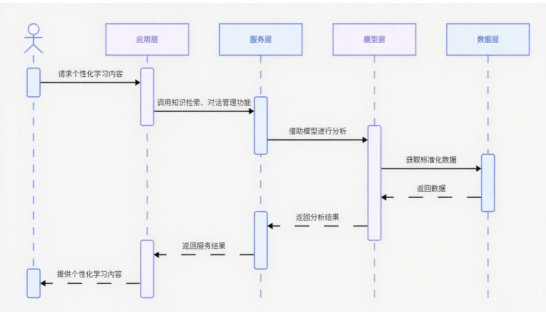 该系统整体采用自下而上的分层架构,由数据层、模型层、服务层、应用层组成。数据层由干部教育培训结构化知识和非结构化学习资源共同构成,通过建设数据总线对多源异构数据实现规范化和标准化;模型层以自主开发的大语言模型为基础,围绕政策话语感知、学习决策等构建专业化的模型微服务,组成领域知识适应性较强的混合型模型组;服务层针对知识检索、会话管理等服务,基于微服务架构封装为高可靠性的智能导学服务。