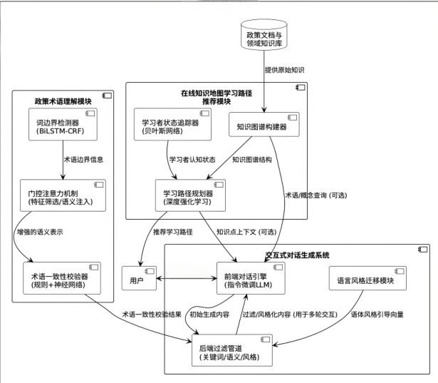 当前,国内的智能导学系统和国外一些已经商用的产品在基础教育方面取得了较成熟的技术方案和应用,在基于规则引擎和机器学习驱动的知识点推荐、学习过程管理等方面有不同程度的实践,但都无法很好地支持干部教育领域的使用场景。一是学习内容指向政策相关的议题,对政策术语的理解应精准;二是组织规范严格要求,严格按照国家主流观点,不容丝毫松懈。国内大语言模型在应用层面的落地速度迅猛,在开放领域问答、个性化自主学习方面具有巨大应用前景。但现有的主流国际模型缺乏对国内中文政策文本的良好适应性,国内开源模型虽具有对中文政策内容较强适应能力,但其还面临着语言模型领域内专业领域适配、长篇文本语义理解等难题,针对干部教育实践中的常见政策文件讲解、时事政策类词条翻译等特定问题,其准确性、有效性尚需提高。
