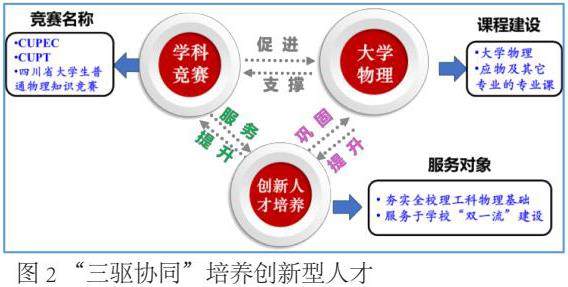 通过探索理论和实践一体化教学,构建“三驱协同”(“创新实验、学科竞赛、创新课题”为三驱)的创新人才培养模式。引领学生参与创新实验,精心设计基础探索性实验项目,供全体学生自主学习完成;将学科竞赛如大学生物理学术竞赛、四川省平台物理知识竞赛和大学生物理实验竞赛中往届题目,融入课程教学,基于“问题导向性”设计,让学有余力的学生自己设计实验方案提出设备需求,并解决相关物理问题。通过三驱协同,实现创新能力的个性化培养,从而实现人才的全方位培养。