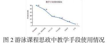 从图1可以看出,教师在教学中不仅运用了传统的指导纠错法、示范法、直接讲授教学法和分解教学法,还运用了趣味性较强的游戏法和比赛法调动学生的积极性,建立良好的互动。值得一提的是案例法和情景法,适合游泳课程思政的教学,比如模拟溺水场景以及施救现场,或是对体育人物、事迹的描述等;多媒体教学法使用次数较少,主要由于课堂条件的限制,多媒体设施还没有具备在泳池边放置的条件。