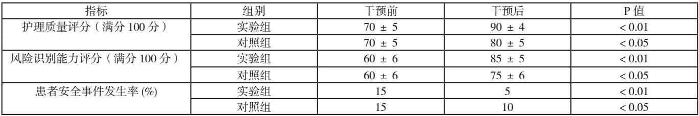 实验组的护理质量评估从70分跃升至90分,风险辨识能力得分则由60分增长至85分,而患者安全事件的发生比率则从15%显著降低至5%。相比之下,尽管对照组的护理质量评分也有提升,从70分上升至80分,风险识别能力从60分增进到75分,且患者安全事件发生率降至10%,但其改善幅度不及实验组显著。