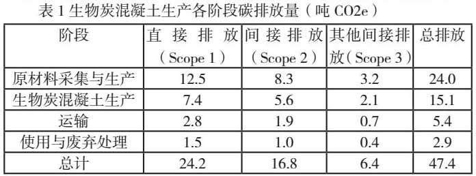 本研究根据生命周期评价(LCA)方法,对生物炭混凝土生产过程中的碳排放量进行了详细评估。以下为各阶段的碳排放量评估结果: