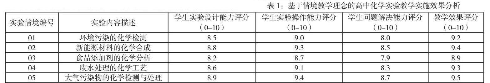 实验教学模式的构建还需配合科学的评价体系,确保学生在情境教学中的表现能够得到合理的评估。这包括对学生实验设计能力、操作能力、问题解决能力等多方面的综合评价,以促进学生全面发展并激发其学习的内在动力【2】。表1展示了某高中基于情境教学理念的实验教学实施效果分析,数据从实际教学中收集,反映了学生在不同实验情境下的表现情况及相关教学效果。