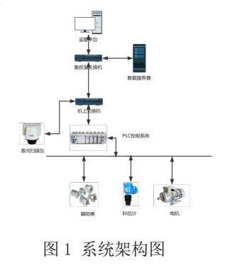 为了提高对料场内散料的堆、存等管理,本文所设计的悬臂式斗轮堆取料机智能化控制系统,主要是实现自动扫描散料堆场,获取点云分布数据,自动堆料、自动取料等功能。本系统主要有几大子系统,主要包含:通信系统、定位系统、PLC控制系统、激光扫描系统、综合信息处理系统等。如图1所示,现场所有的设备数据和信号全部通过现场PLC控制系统进行采集,再通过光纤与集控室进行数据传输,集控室部署激光扫描系统和综合信息处理系统实现对PLC数据的直接读写和对激光扫描仪的控制。