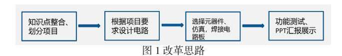 在《数字电子技术》的教学改革中,根据该课程的学习内容的顺序设计由简到繁的小项目,如图3所示。在学生中主要设计了如下项目:(1)根据前期学习的基础知识及组合逻辑电路的分析与设计,利用门电路设计三人表决器或四人表决器,初步掌握组合逻辑电路的设计方法,通过制作提高对门电路等集成器件的选择和使用;(2)学习触发器电路的构成、功能及工作原理,利用JK触发器及门电路设计四人智力竞赛抢答器;(3)学习寄存器或集成计数器电路的的构成、功能及工作原理,利用寄存器或十进制计数器74LS160、译码器及7段数码管设计电子时钟电路;(4)学习数据选择器和集成计数器知识,利用74LS151、74LS160等门电路实现序列码发生器,提高对中规模集成电路的选择与运用能力;(5)学习555定时器及由555定时器构成电路的功能及工作原理,利用555定时、计数器及译码器构成流水灯电路;(6)利用本课程学过的内容设计电路实现十字路口交通灯的功能。
