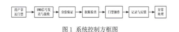 当配置 UWB 控制模块的用户车辆进入门禁信号覆盖范围,车辆上的 UWB 标签发信号,门禁系统的 UWB 接收器接收并解析信号,与预先存储的用户信息比对,比对成功确认身份有效,否则无效。系统检查用户权限,满足要求则在用户车辆到达开门范围时发送指令执行开锁操作,未到达则等待,同时记录车辆出入记录。系统可通过手机 APP 等向用户或管理员反馈。若身份验证或权限检查出现异常,执行异常处理流程。