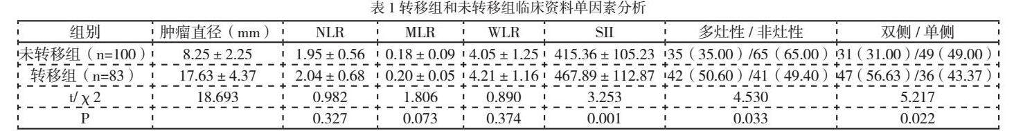 单因素分析显示,转移组和未转移组在双侧肿瘤、多灶性、肿瘤直径、SII比较差异显著(P<0.05),在NLR、MLR、WLR比较差异不显著(P>0.05)。多因素回归分析显示,肿瘤直径(P < 0.001,OR:1.256,95% CI:1.112-1.299)、SII(P = 0.030,OR:1.007,95% CI:1.001-1.010)是PTC患者淋巴结转移的独立预测因素,见表1和表2。