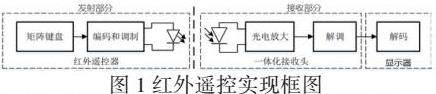 红外(IR)遥控是一种无线、非接触控制技术,常用于遥控器、无线键盘、鼠标等设备之间的通信。IR协议的工作原理是,发送方通过红外线发送一个特定的编码,接收方通过识别该编码来执行相应的操作。红外遥控系统分为发射和接收两部分,发射部分的发射元件为红外发光二极管,它发出的是红外线而不是可见光;接收部分的红外接收管是一种光敏三极管。红外遥控实现框图如图1所示。