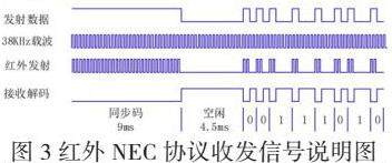 IR协议是红外线通信协议的总称,而NEC协议是IR协议中的一种具体实现,协议收发信号说明见图3。
