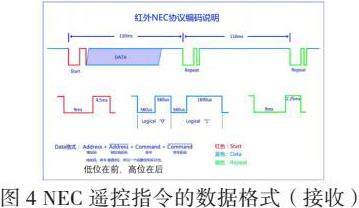 NEC遥控指令的数据格式为:同步码头、地址码、地址反码、命令码、命令反码,以接收为例说明如图4所示。同步码由一个9ms的低电平和一个4.5ms的高电平组成,地址码、地址反码、命令码、命令反码均是8位数据格式。按照低位在前,高位在后的顺序发送。采用反码是为了增加传输的可靠性(可用于校验)。每次信息都是按照同步码(9ms载波脉冲+4.5ms空闲信号)、地址码、地址反码、命令码和命令反码的格式进行传输,因此,单次信息传输的时间是固定不变的。
