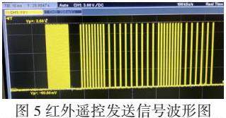 红外遥控常用的有通过脉冲宽度来实现信号调制的PWM(Pulse Width Modulation脉宽调制)和通过脉冲串之间的时间间隔来实现信号调制的PPM(Pulse Position Modulation脉冲位置调制)两种方法,本文采用PWM的方式进行编码,红外遥控发送信号波形如图5所示。