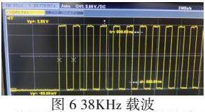 数据的每一位(Bit)脉冲长度为560us,由38KHz的载波脉冲(carrier burst)进行调制,如图6所示,推荐的载波占空比为1/3至1/4。