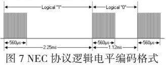 有载波脉冲的地方,其宽度都为560us,而载波脉冲的间隔时间是不同的。NEC协议逻辑电平编码格式如图7所示。