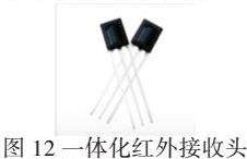 红外接收装置是由红外接收电路、红外解码、电源和应用电路组成,主要作用是将红外发射装置发过来的红外线转换为电信号,再经过放大、限幅、检波、整型,最终形成遥控指令脉冲传输到微控制器当中。红外接收头通常被厂家集成在一个元件中,成为一体化红外接收头,如图12所示。