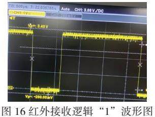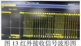 红外接收头共有三个引脚VOT(传出解码数据)、GND、VCC,内部的三极管电路具有信号反向的功能,也就是正好和发射端相反,即将1变为0,0变为1。红外接收信号波形如图13所示。