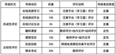考评方式包括形成性评价和总结性评价。形成性评价涵盖在线资源学习、在线测试作业、在线讨论互动、翻转课堂和课程项目,其中在线资源学习、在线测试作业、在线讨论互动分别占 10%、10%、5%,由泛雅平台(学习通)评分;翻转课堂占 20%,由教师评分、组内互评、组间评价决定;课程项目占 15%,由教师评分和组内互评决定。总结性评价包括实验技能和期末考试,实验技能占 20%,由跨境电商模拟仿真平台评分;期末考试占 20%,由教师评分。