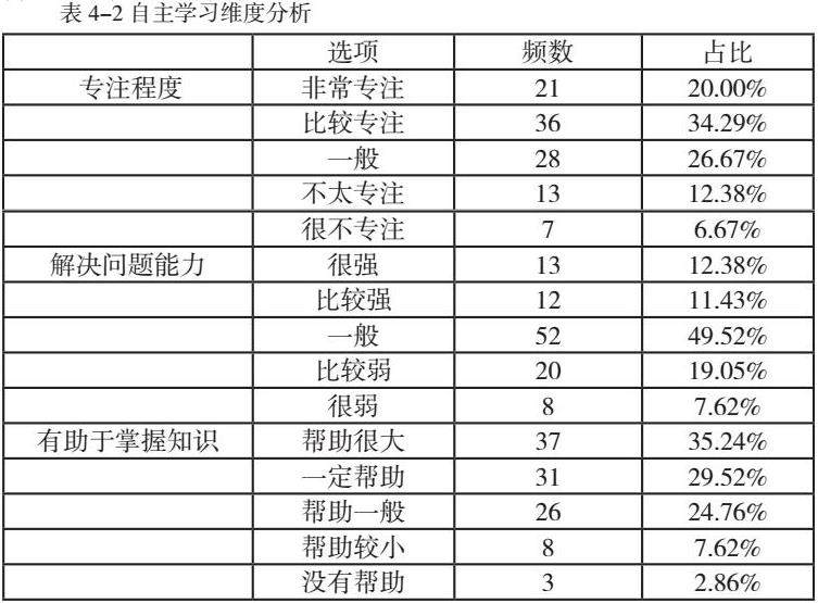 如表4-2所示,54%的学生表示在自主学习时能够达到“比较专注”及以上,其中“非常专注”的占20%。这说明大部分学生在自主学习过程中能够保持一定的专注度,约46%的专注度有待提高。这可能与学生的自主学习能力、自我管理能力以及学习材料的吸引力等因素有关。
