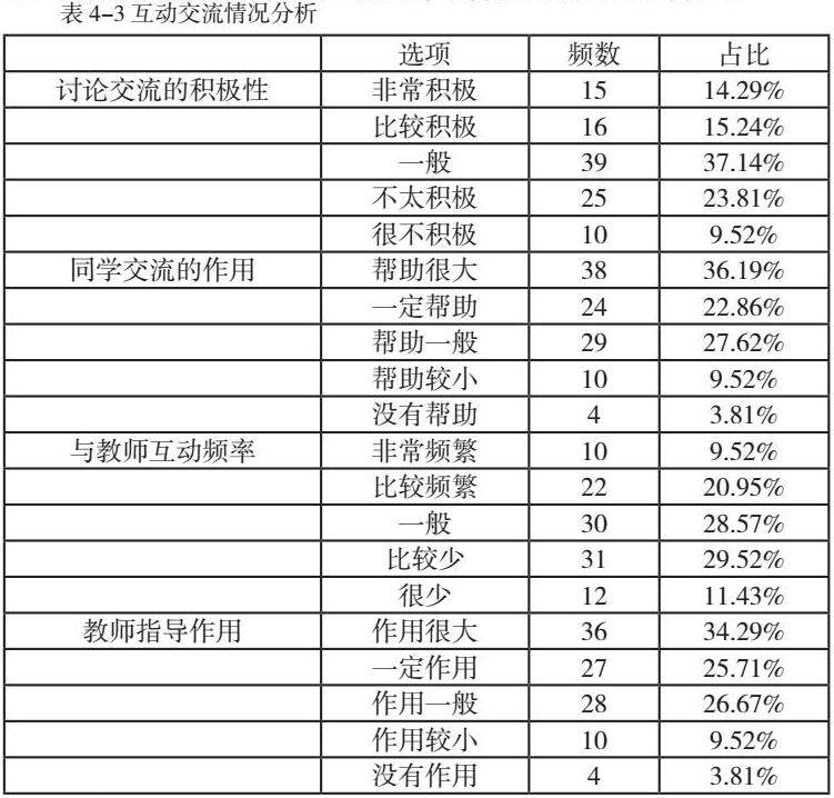 尽管大部分学生能够积极参与课堂讨论,但仍有部分学生在与教师的互动交流上不够频繁,这可能影响学生及时获得教师的指导和反馈。有可能翻转课堂中的讨论环节未能充分激发学生的参与热情,或者讨论话题的吸引力不足,导致学生讨论不积极。学生性格差异,部分学生性格内向,不善于在公共场合表达自己的观点,导致在课堂上的互动交流受限。另外,教师在课堂讨论中的角色定位可能不够明确或缺乏足够的引导,有效促进学生的互动交流的作用要加强。