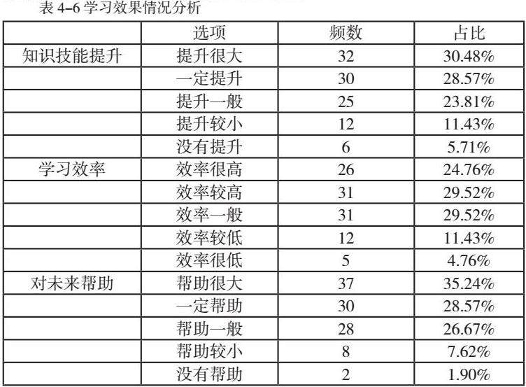 表4-6显示,在知识技能提升方面,有八成的学生觉得在跨境电商运营方面的知识和技能有一定提升,其中认为“提升很大”的占30.48%。在学习效率方面,认为在本课程中的学习效率为很高的占24.76%,而15%的学生任务效率有待加强。在对未来帮助方面,63.81%的学生认为本课程对未来从事相关工作或学习有“一定帮助”及以上,认为“帮助很大”的占35%。