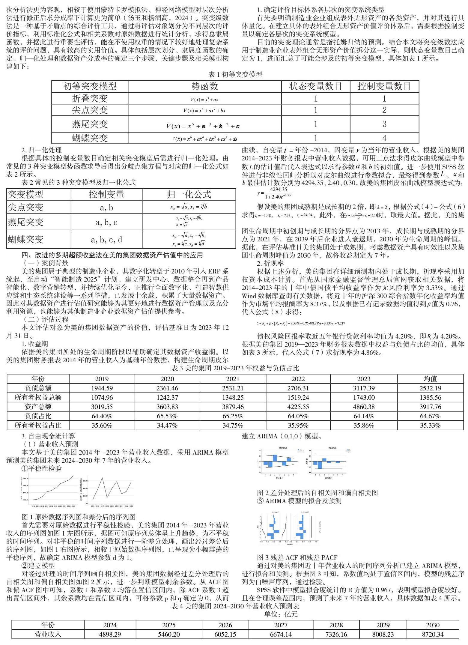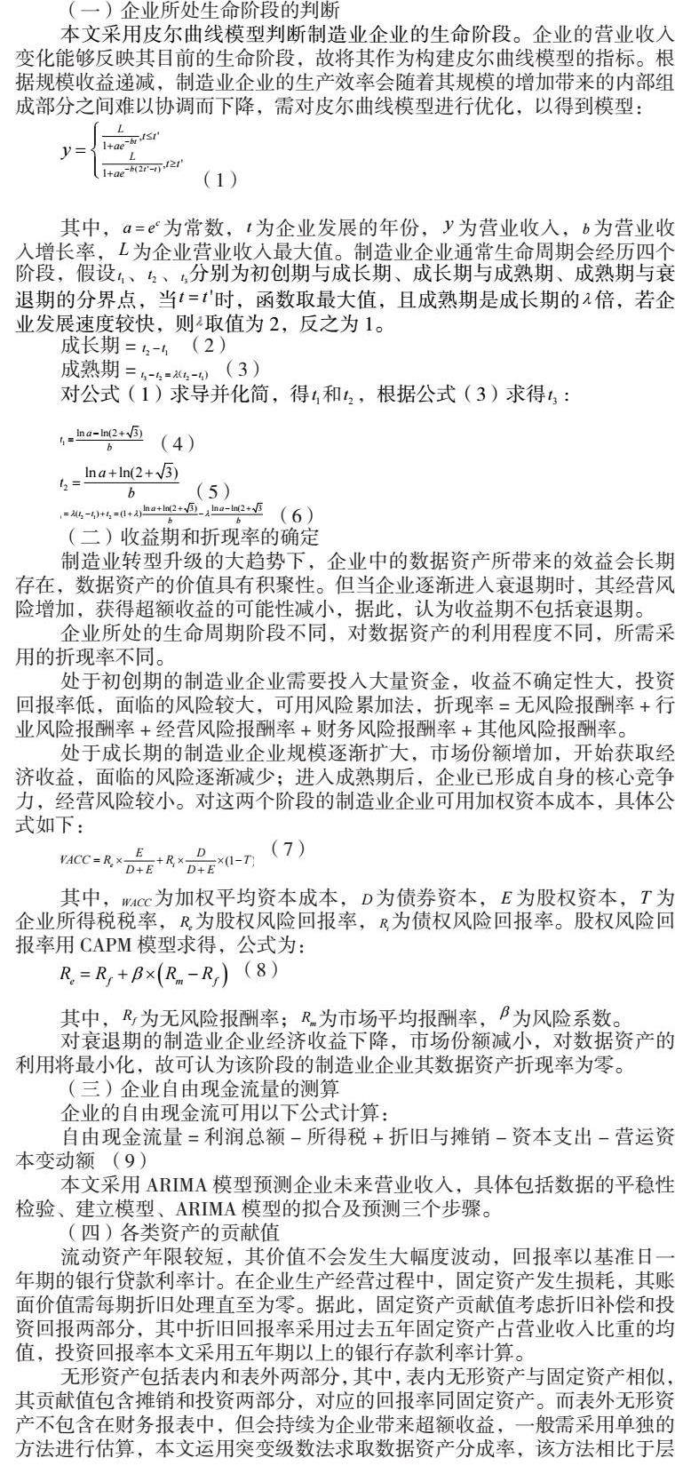 基于数据资产具有的依附性、价值易变形等特点,现有学者更多地将其视为特殊的无形资产,且视为表外无形资产进行衡量。多期超额收益法下,对于数据资产收益期的预测以及其在表外无形资产价值中的分成率的确定是评估的难点所在。本文将按以下思路改进多期超额收益法并构建模型:首先,考虑数据资产依附性的特点,将运用皮尔曲线模型分析制造业企业生命周期,以辅助预测收益期和相应的折现率;其次,采用ARIMA模型预测企业营业收入以预测企业未来自由现金流;最后,测算各类资产贡献值,采用突变级数法计算数据资产分成率,将其从表外组合无形资产中剥离出来,并折现得到数据资产价值。