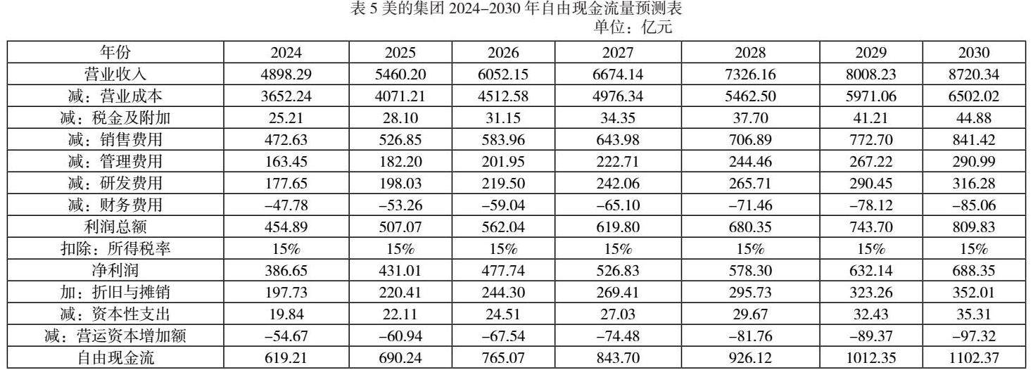 美的集团为高新技术企业,所得税税率为15%,假设未来7年仍保持此税率。未来7年营业收入预测如前文所述,对于营业成本、税金及附加、销售费用、管理费用、研发费用、财务费用、折旧与摊销、资本性支出、营运资本增加额的预测均按照过去五年各自占营业收入比重的均值,分别为74.56%、0.51%、9.65%、3.34%、3.63%、-0.98%、4.04%、0.40%、-1.12%。具体数据如表5所示。
