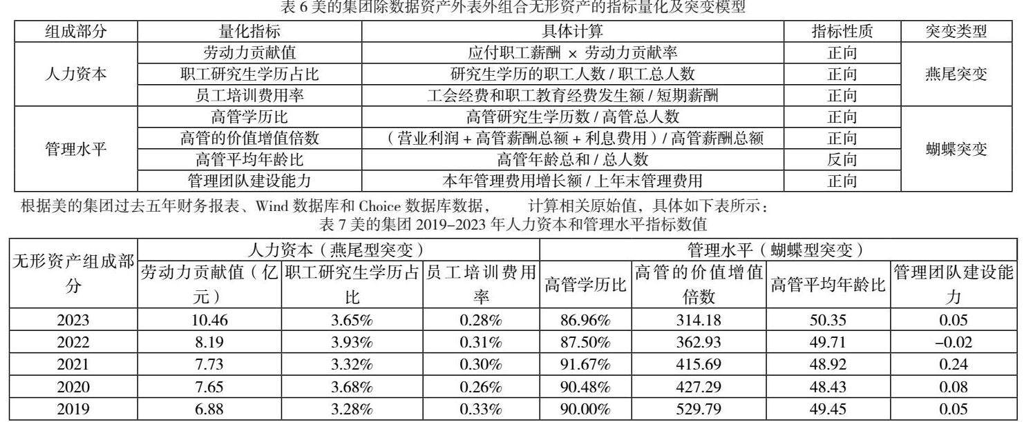 根据除数据资产外表外组合无形资产的量化指标情况,确定对应突变模型:人力资本确定为燕尾突变,管理水平确定为蝴蝶突变,两项指标均为非互补型关系。此处对突变级数法的应用需要注意,该两部分为相互独立的部分。据此得到美的集团除数据资产外表外组合无形资产的指标量化及突变模型情况,如下表所示: