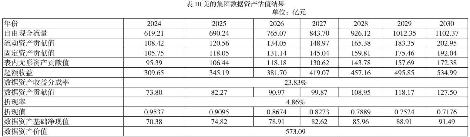 根据预测的美的集团未来自由现金流减去固定资产、无形资产和表内无形资产的贡献值以得到超额收益,结合已分析得到的数据资产分成率23.83%求得各年贡献值,最终折现加总得到基准日美的集团数据资产的估值结果,为573.09亿元,具体如表10所示。根据表中数据可知,美的集团数据资产贡献值是逐年递增的,这与数据资产价值易变性有关,也体现了数据资产的未来发展潜力。
