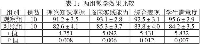 观察组在理论知识掌握、临床实践能力及综合表现评分、满意度方面均显著高于对照组(P<0.05),见表1。
