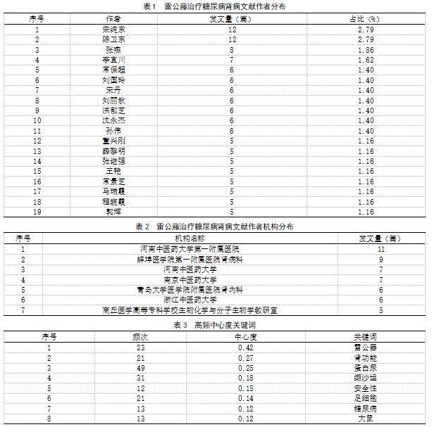 使用Excel软件对筛选出的雷公藤治疗糖尿病肾病文献的作者进行分析。结果显示,发表文献数≥5篇的作者共有19人。其中发表文献最多的作者是宋纯东和陈卫东,各自发表了12篇文献,占总文献数的2.79%,其次是张燕,发表了8篇文献,占比1.86%,其他发表文献≥5篇的作者及其占比见表1。