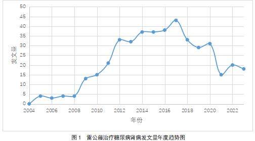 本研究系统梳理了CNKI数据库中2004年至2023年间近20年关于雷公藤应用于糖尿病肾病治疗的相关文献。首先,利用Excel软件对文献的发文趋势、期刊来源、作者及其所属机构进行了统计分析。随后,运用CiteSpace 6.3.R1软件对关键词进行了可视化分析。这些分析使我们能够全面了解雷公藤治疗糖尿病肾病的研究现状、研究热点及发展趋势等重要信息。