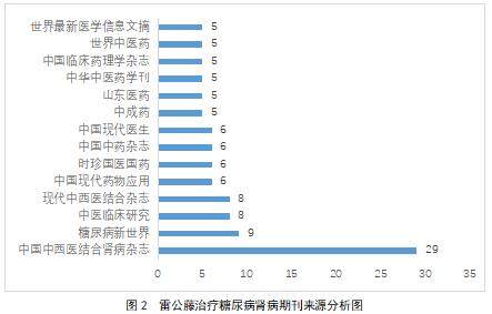 使用Excel软件对筛选出文献的期刊来源进行分析,发现430篇关于雷公藤治疗糖尿病肾病的文献发表在200家期刊上。其中发文量≥5篇的期刊有14家,具体期刊见图2。从图表中可以看出,《中国中西医结合肾病杂志》是收录相关文献最多的期刊。该刊自2000年创刊以来,一直由中国中西医结合学会负责主办,并接受中国科学技术协会的指导。作为一份医学领域的学术期刊,它致力于分享和推广我国在中西医结合领域的临床实践、科研成果及预防策略,以此推动我国医学科学的现代化进程。