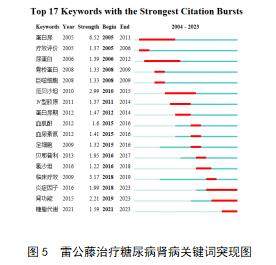 从关键词突现图可以看出,近年来的热点倾向于糖尿病肾病的机制研究。目前临床上关于糖尿病肾病的具体发病机制仍存在争议,多数学者认为其主要是由糖代谢水平紊乱、细胞因子异常改变和血流动力学紊乱等因素引起的。糖尿病患者长时间处于代谢紊乱状态,将会引发一系列的全身炎症反应,从而诱导糖尿病肾病的发生。免疫炎性反应的激活是该类疾病发生和发展的重要因素。因此,雷公藤作为免疫抑制剂,可有效抑制巨噬细胞在肾脏中的活化和浸润活动,从而有效缓解炎症反应,对糖尿病肾病的治疗具有较高的价值[13][14]。