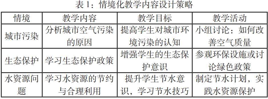情境化教学内容的设计旨在通过将学生熟悉的生活情境与地理学科知识结合,以便于他们更好地理解人地协调观的理念。通过用富有情节故事化、问题化的情境来感染和激发学生,让学生在真实的情境中产生生活的触动而引发学习兴趣,并增强他们解决实际问题的能力。以下表1展示了不同情境下的教学内容设计策略和对应的教学目标: