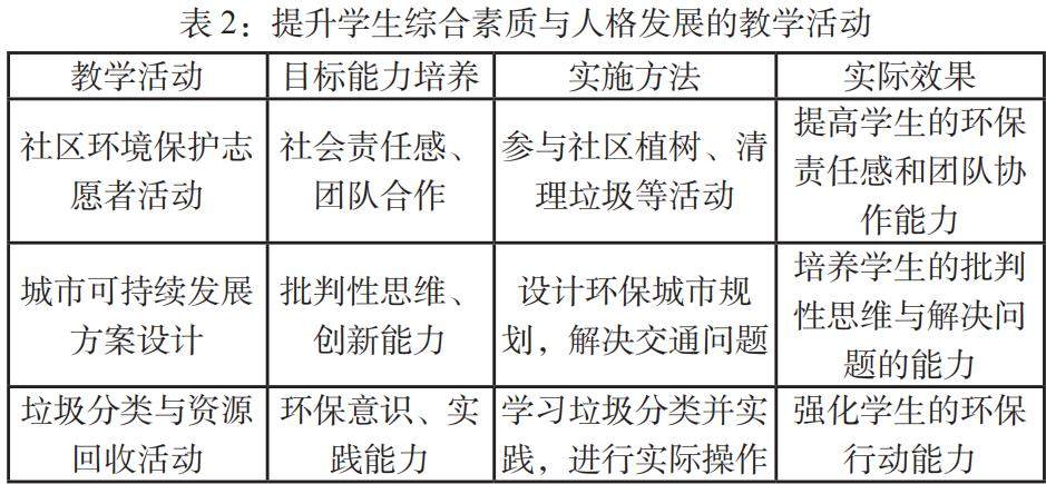 提升学生的综合素质与人格发展不仅仅是学科知识的传授,更是注重在实践活动中锻炼学生的责任感、合作精神和创新能力,通过情境化教学,使学生学会分析与平衡个人的需要与社会责任,培养自我管理和团队协作的能力。以下表2展示了如何通过不同的教学活动提升学生的综合素质和人格发展: