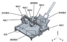 该自动盖章机主要由机架、换纸模块、进纸模块、定位模块和盖章模块五部分组成。