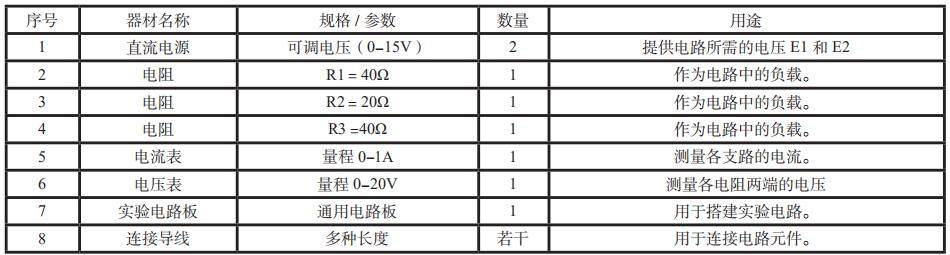 实验结果表明,学生能够直观地理解基尔霍夫定律的物理意义,并掌握电路分析的基本方法。同时,实验器材的表格化设计有助于学生清晰地了解实验所需的工具和材料。