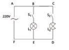 某家用照明电路如下图所示,已知电源电压 E = 220V,灯泡 L1 和 L2 的电阻分别为 R1 = 100Ω 和R2 = 200Ω,开关 S1 和 S2 分别控制灯泡 L1 和 L2。