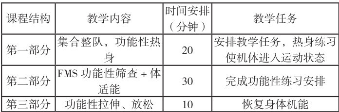 实验组教学组在运动时引入 FMS 功能性筛查 + 体适能,而对照班按照常规教学的内容和流程进行训练。