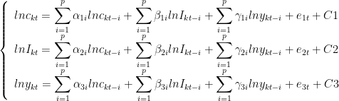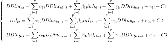 模型中,字母 k 为 1 时代表城镇,k 为 2 时代表农村。 lnckt 代表 t期江西省居民消费支出, lnIkt 代表 t 期江西省数字普惠金融指数, lnykt 代表t 期江西省居民人均可支配收入,P 为滞后期数,C 为常数,ɑ、 β 、γ 为系数, eit 为残差项。