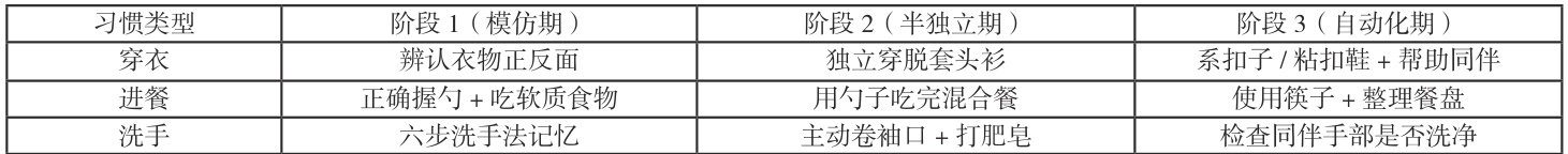 表 1 展示了小班幼儿在穿衣、进餐和洗手三个关键生活习惯上的阶梯式培养路径。在穿衣能力培养方面,从最初级的辨认衣物正反面开始,逐步过渡到独立穿脱套头衫,最终达到能够系扣子并帮助同伴的熟练程度。进餐习惯的培养则遵循从简单到复杂的原则,幼儿先掌握正确握勺和进食软质食物的基本技能,然后挑战用勺子吃完混合餐食,最终进阶到使用筷子和自主整理餐盘的综合能力。洗手习惯的养成同样设置了循序渐进的三个阶段,幼儿首先需要牢记六步洗手法,之后在洗手过程中主动完成卷袖口和打肥皂的动作,最终发展出能够检查同伴手部清洁度的责任意识。这种分阶段的目标设定充分考虑了小班幼儿动作发展和认知能力的特点,每个阶段的要求都建立在上一阶段已掌握技能的基础上,既不会让幼儿感到过于困难而产生挫败感,又能持续推动他们向更高水平发展。