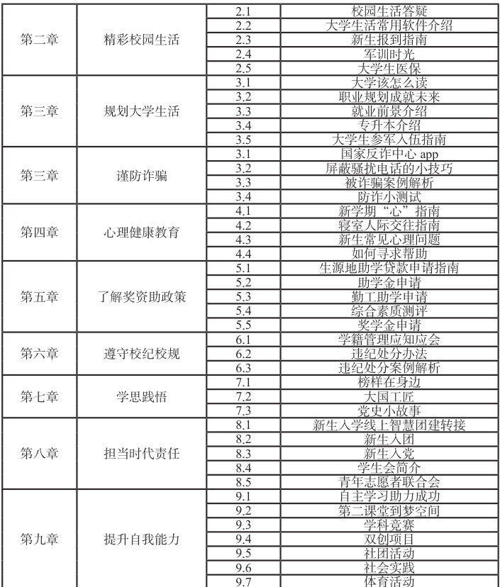 大学生新生入学教育课程利用学习通网络平台,以线上课程教学为主,利用精品资源共享网络教学资源实现学习互动 [11]。课程资源包括视频、动画、图文等形式呈现,方便新生随时随地学习。通过QQ、微信等新生喜闻乐见的新媒体平台,开展线上答疑、推送教育内容、组织线上活动。
