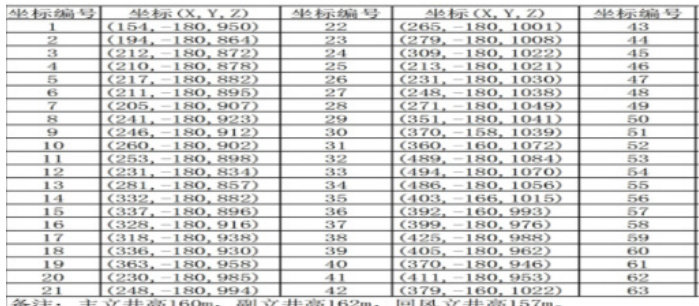 本次仿真建模在矿井应急救援指挥编辑系统中进行,通过收集实际矿山巷道坐标点,构建三维巷道,具体坐标点(部分)如下所示。