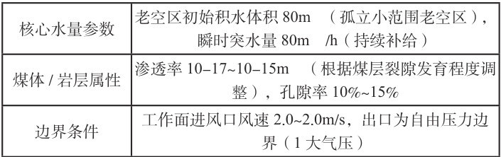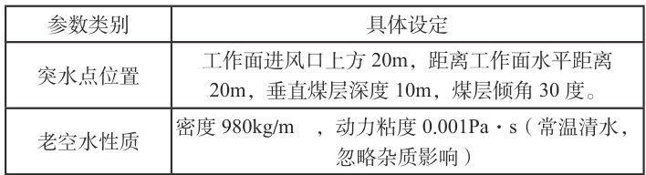 本文选择常见透水点,采煤工作面进行模拟,依据矿山实际情况,本次模拟透水点选择在工作面进风口上 20 米位置,突水点假定在距离工作面 20 米,垂直于煤层 10 米的地方,模拟老空水的透水。具体模拟设定参数如下: