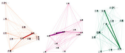 由最左侧图中知,在 2000 至 2010 年四川与陕西之间的线条最粗,表明两者的合作最为频繁,其后依次是四川与青海之间的合作、四川与重庆之间的合作。这也表明四川、陕西、重庆和青海在2000年至 2010 年期间在学术合作网络中扮演着核心角色,也显示出地理邻近性对学术合作的影响。其中,四川是学术合作最为中心的省份,可能是由于四川的高校数量多且科研实力较强。边缘省份如西藏、内蒙古等与其他省份的合作较少,则大概率是由于科研资源和科研人才较为匮乏。